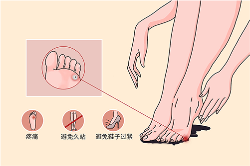 那“鸡眼”是怎么形成的呢?鸡眼俗称“肉刺”,一般是患者足部皮肤长期受压和摩擦引起的局限性、圆锥状角质增生,并且**站立和行走的人也较易长鸡眼,该疾病的主要诱因是摩擦和压迫,一般没有传染性。常见的有硬鸡眼和软鸡眼两个类型,硬鸡眼比较多见,颜色是黄色的,表面比较硬。软鸡眼一般生长在脚趾中间,呈白色,带臭味。